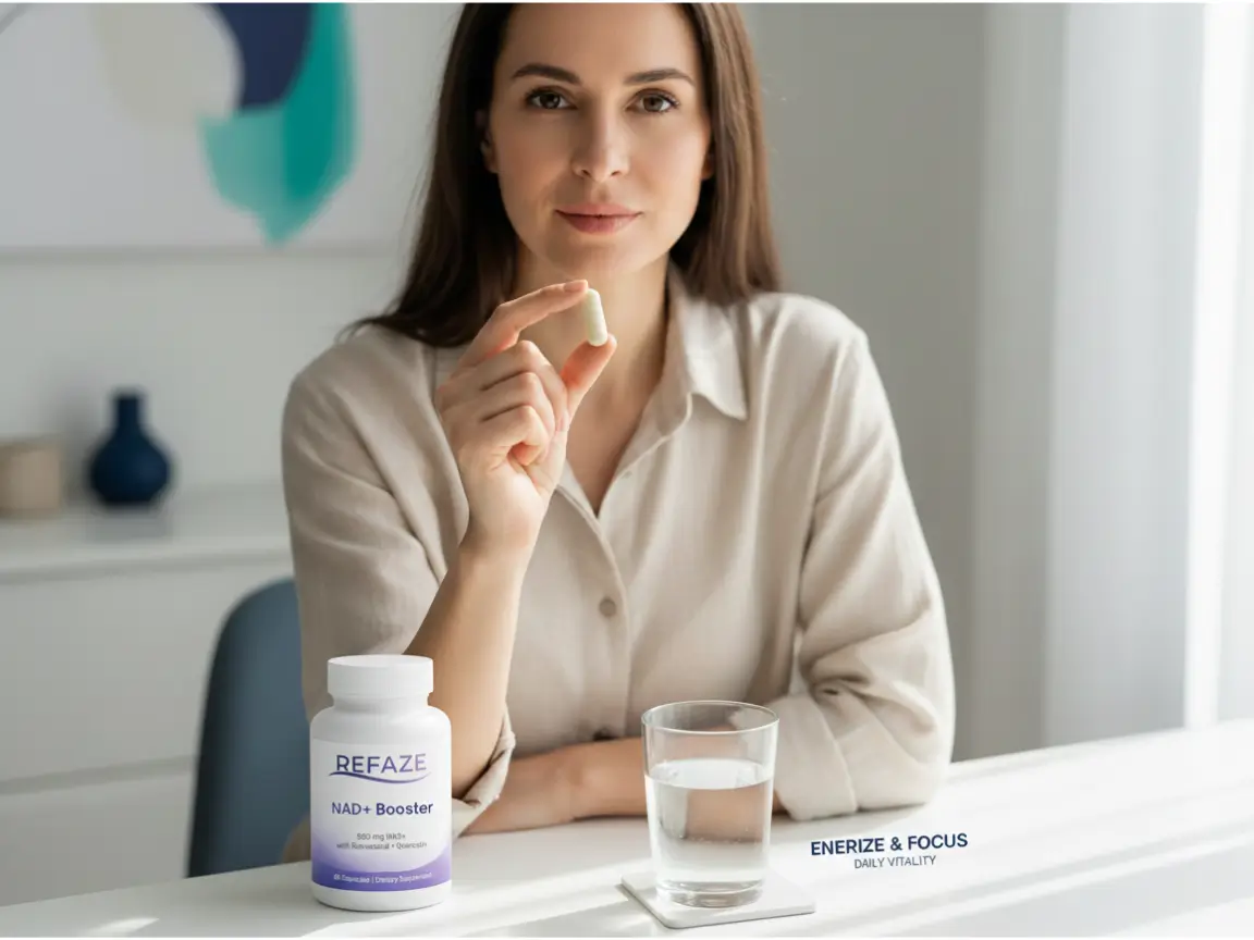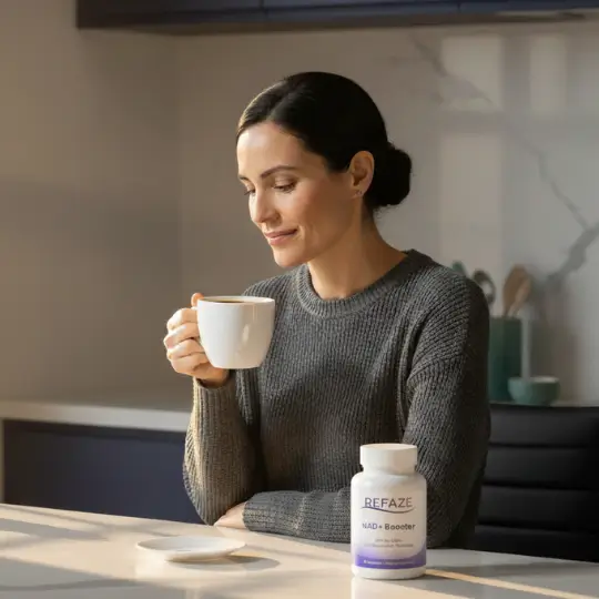 REFAZE replenishes NAD⁺ to recharge energy production inside every cell. Feel alert, productive, and balanced from morning to night.