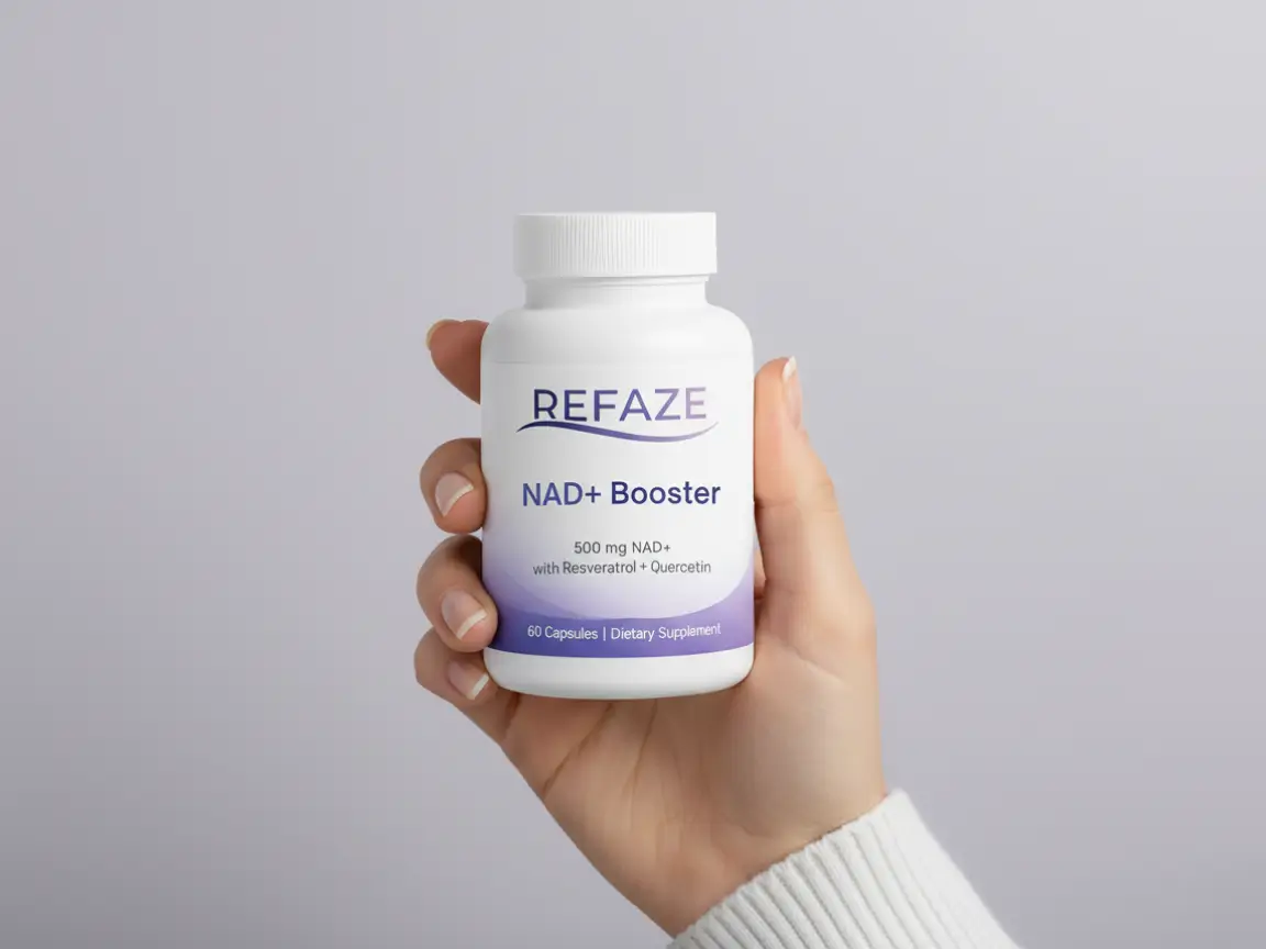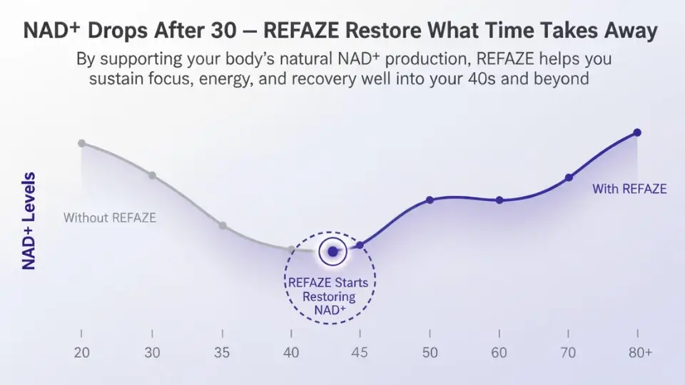 By your late 30s, NAD+ - the molecule that fuels every cell - can drop by nearly 50%. REFAZE restores it using a synergistic trio of NAD+, Quercetin, and Resveratrol to renew energy metabolism, enhance focus, and support longevity pathways.